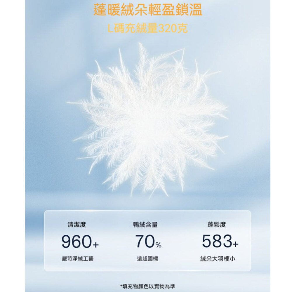 填充物:70% 鴨絨,30%鴨毛;帽子填充物:100% 再生聚酯纖維